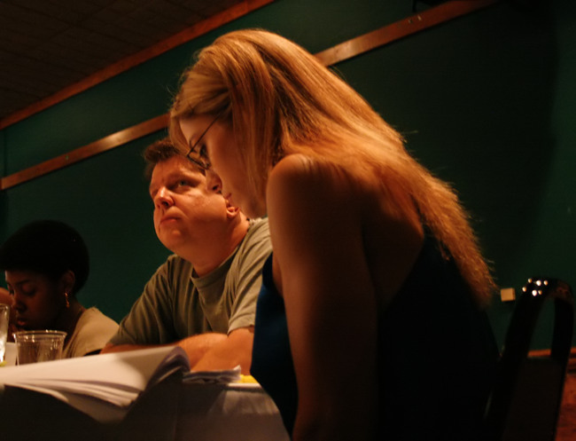 Lead Actress Caitlin McIntosh (Laura) reads through her script while Jay Kelley (Homeless Guy) listens to Director Wyatt Weed.